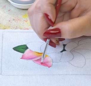 13. Com pouca tinta Amarelo Ouro na pontinha do pincel, pincele a base da pétala.