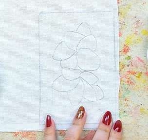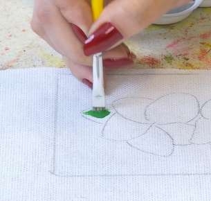 02. Posicione o tecido sobre a placa de MDF preparada com cola permanente e transfira o risco com o auxílio de papel carbono e lápis.